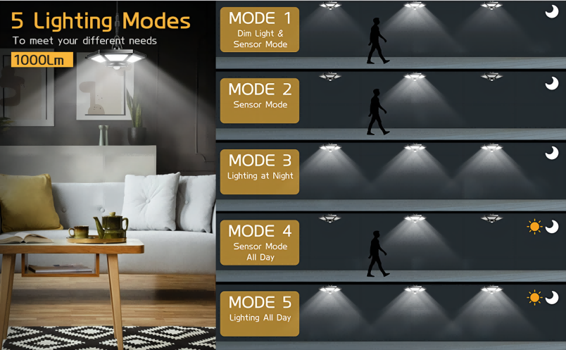 Outdoor solar motion sensor shed lights with 5 lighting modes.