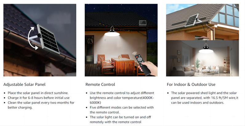 4.Wide Application This solar powered shed lights have 3 Color Temperature: 4000K-6000K( Warm, White, Mix color), 3 in 1, which can meet the needs of different environments and scenarios,
