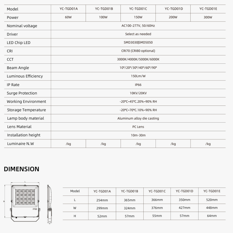 | YC-TGD01-50W | 358*294*52 | 50w | Heat sink Aluminum body,Glass,Bracket,304 screws, PCB, LENS. |